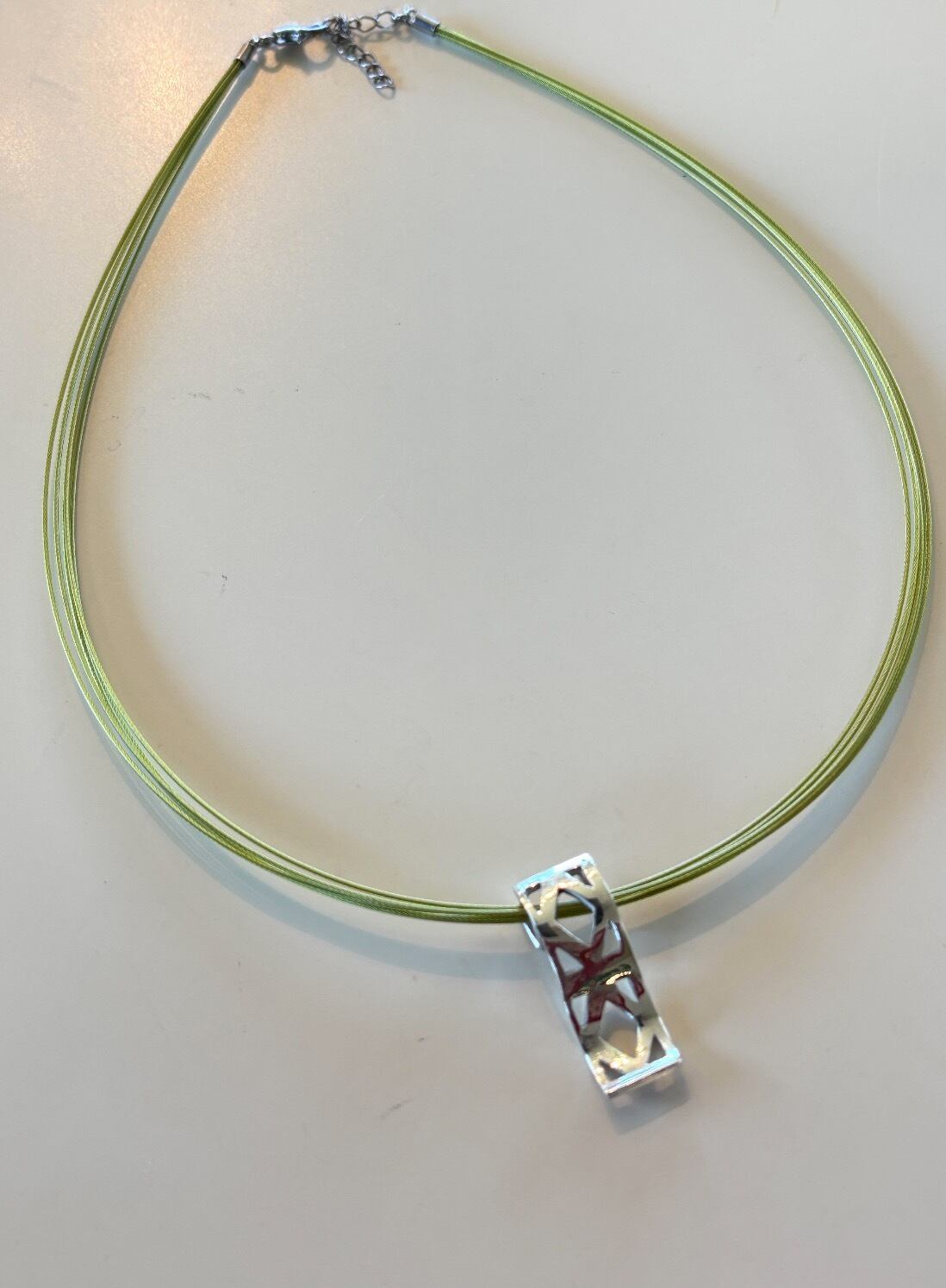 御守りジュエリー「KAFU」シリーズ花ブロックのネックレスです。グリーンがアクセントのワイヤーチェーンは軽くてスタイリッシュなデザインです。我が家は築50年以上の外人住宅。まわりにはなんだか懐かしいような雰囲気が漂う幾何学模様の花ブロックが優しく家を守ってくれています。何十年もの時を経て今なお愛されるモチーフ。理想のデザインのあり方で憧れます。その姿を小さく、小さくそのままに御守りのように作ってみました。