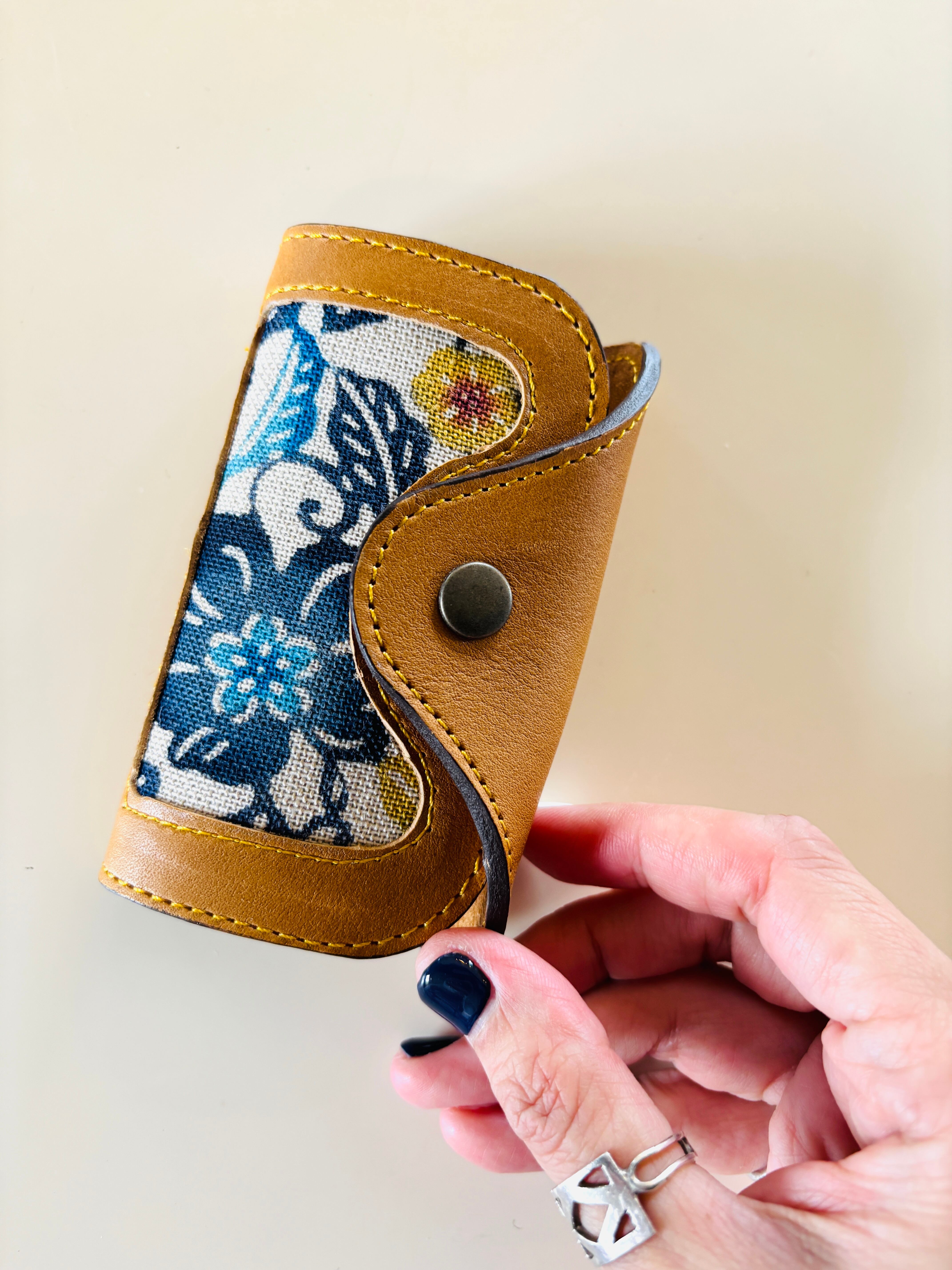 上質な本革のキーケース。ナチュラルな革色に紅型はハイビスカス「あかばな」をあしらいました。贈り物としても。