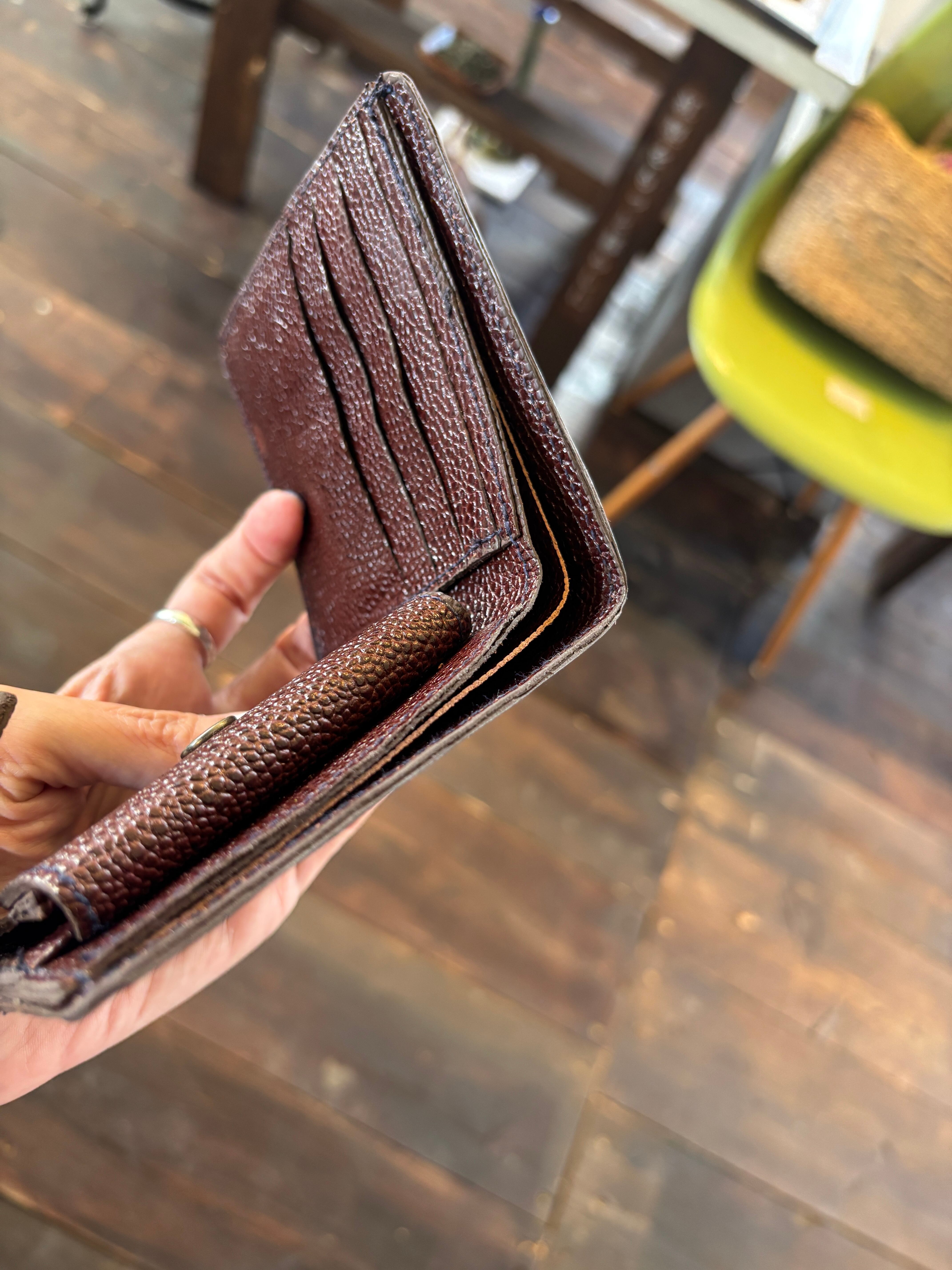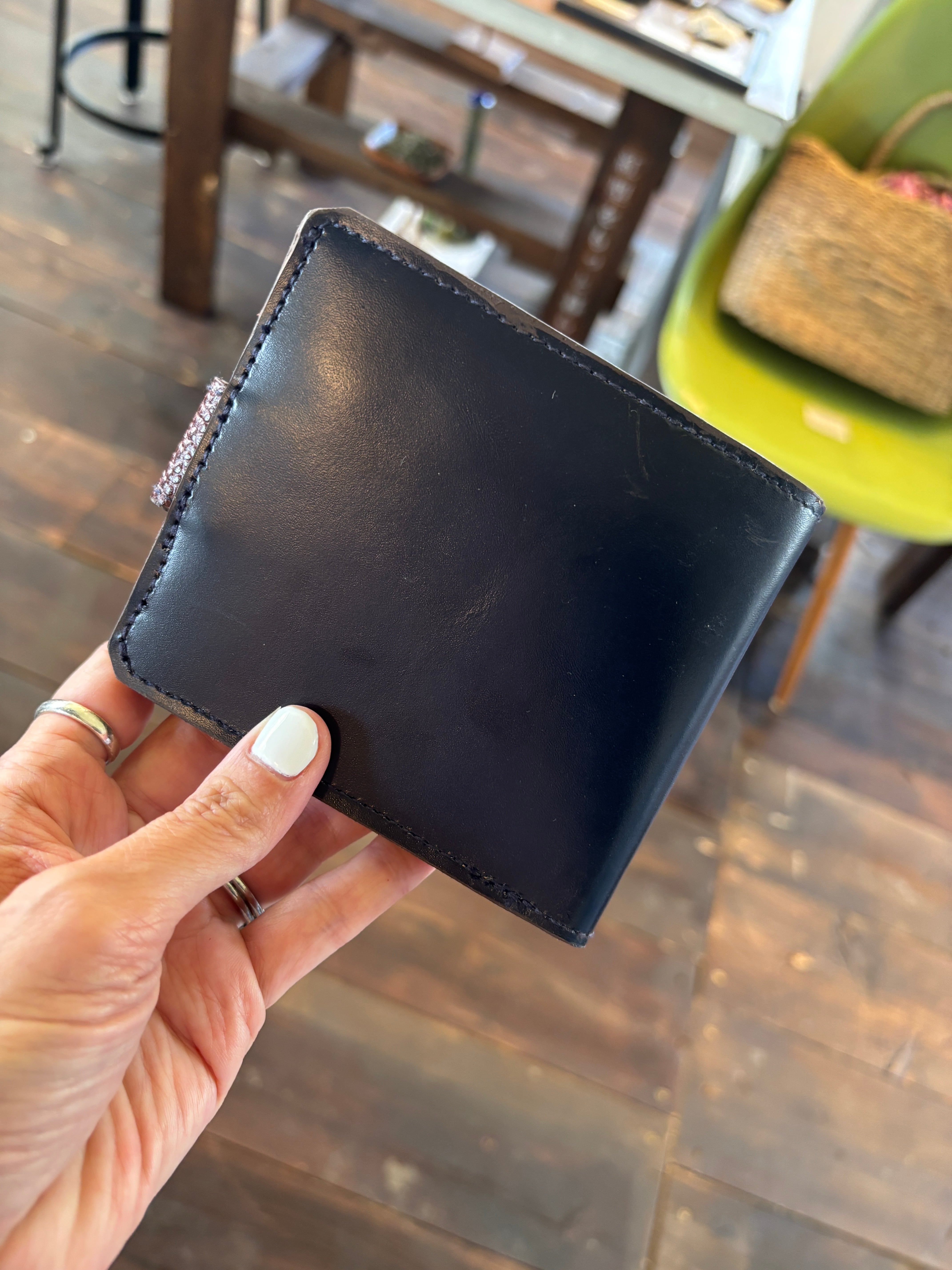 上質な本革の花二つ折り財布。差し込みタイプです。深いネイビー(藍色)の本革に「アカバナ」の紅型をあしらっています。差し込みと内側にはクロコ調の型押しを使用しています。贈り物としてもどうぞ。ギフトラッピング無料で承ります。