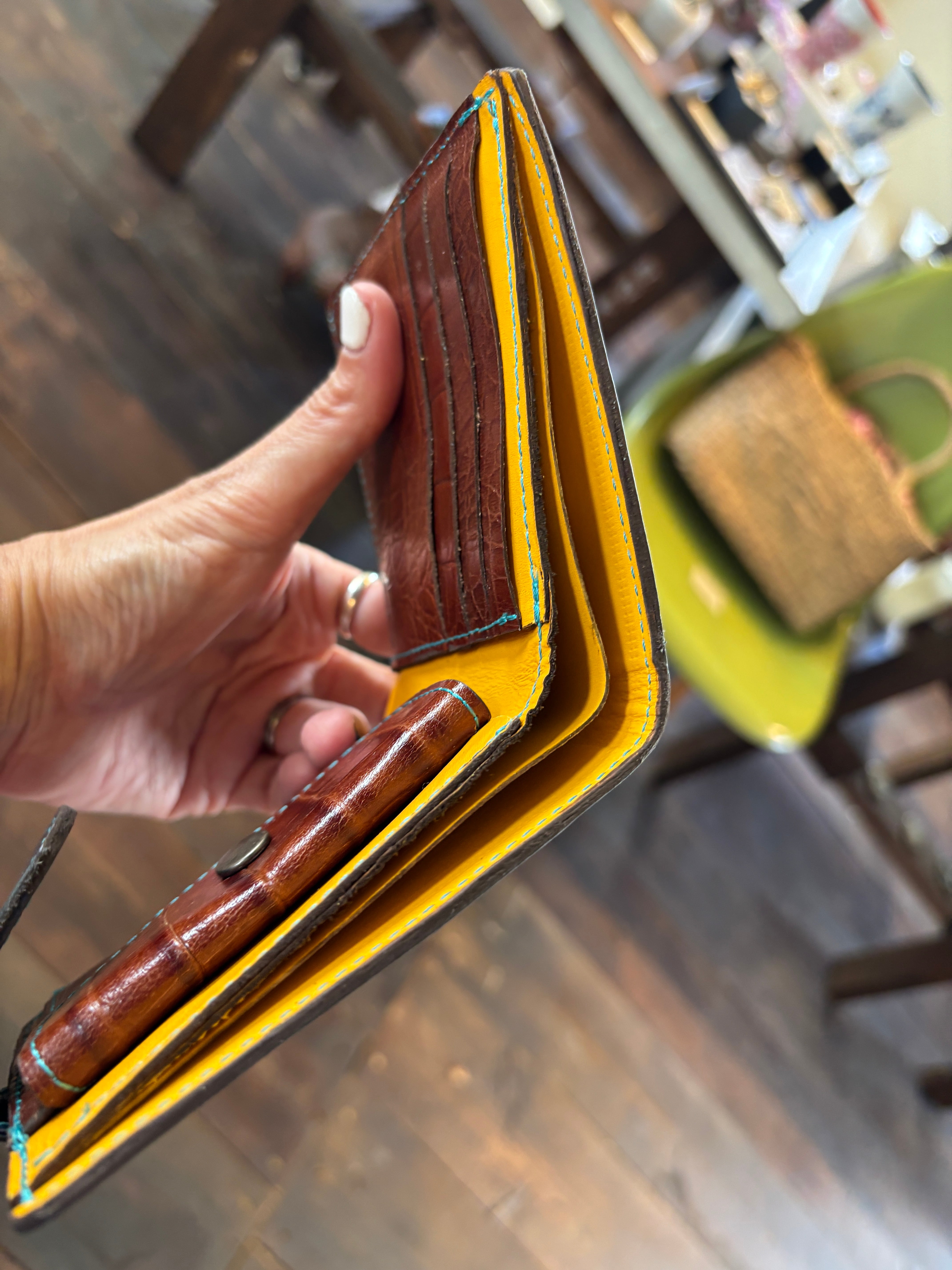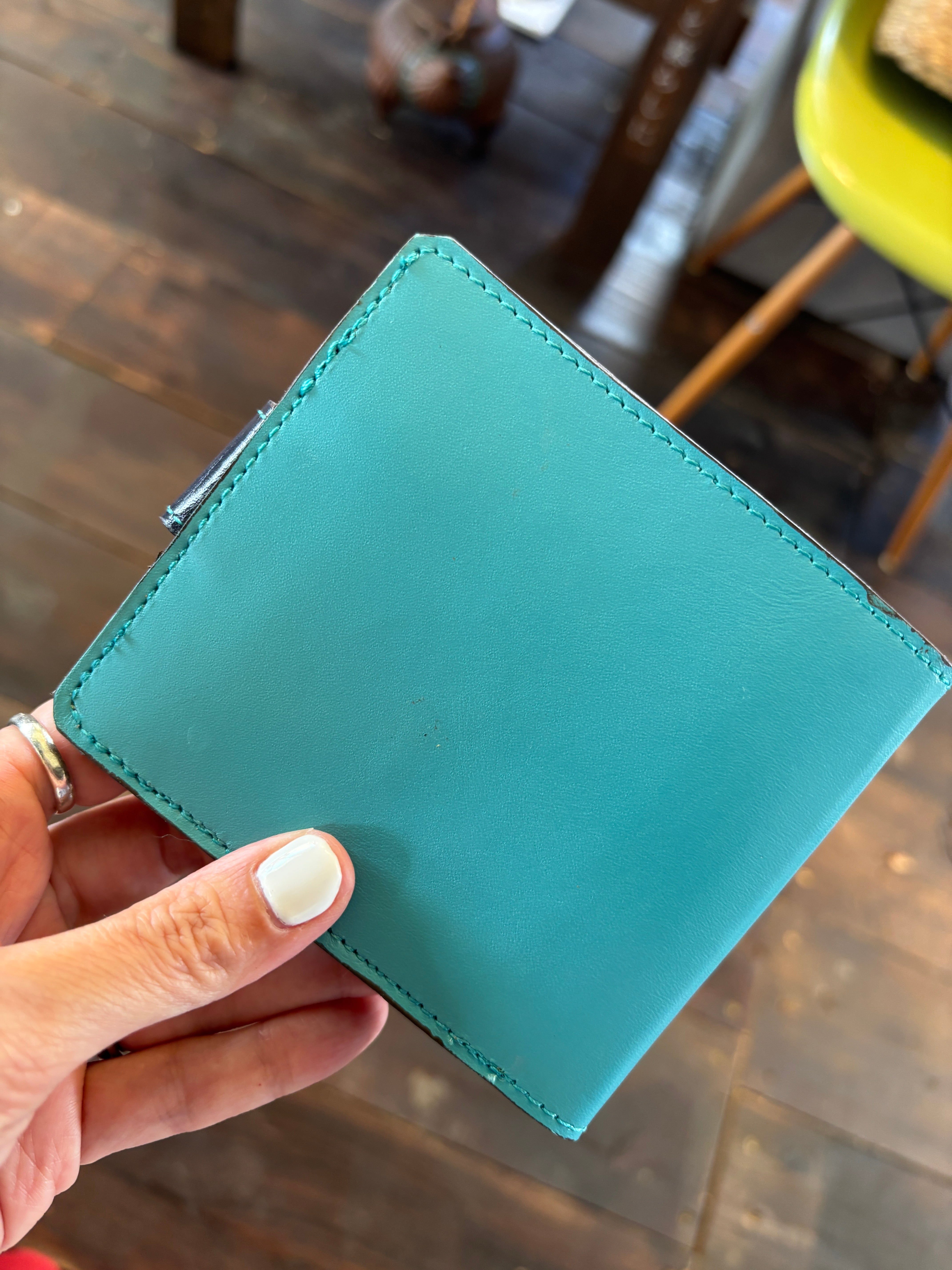 上質な本革の花二つ折り財布。差し込みタイプです。沖縄の海のようなターコイズブルーの本革に「うるま」の紅型をあしらっています。差し込みにはネイビーにスカイブルーのステッチ。内側のポケットにはクロコ調の型押しにブルーステッチ。サプリカラーの辛子色がアクセントになっています。贈り物としてもどうぞ。ギフトラッピング無料で承ります。