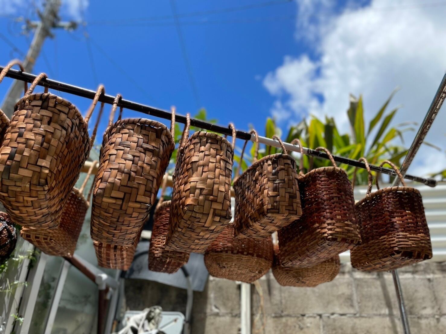 ひとつ、ひとつ職人さんによって丁寧に作られたくーず(とうつるもどき)のかごバッグ。それを私たちで色を入れ紅型をあしらいました。同柄の巾着付きです。