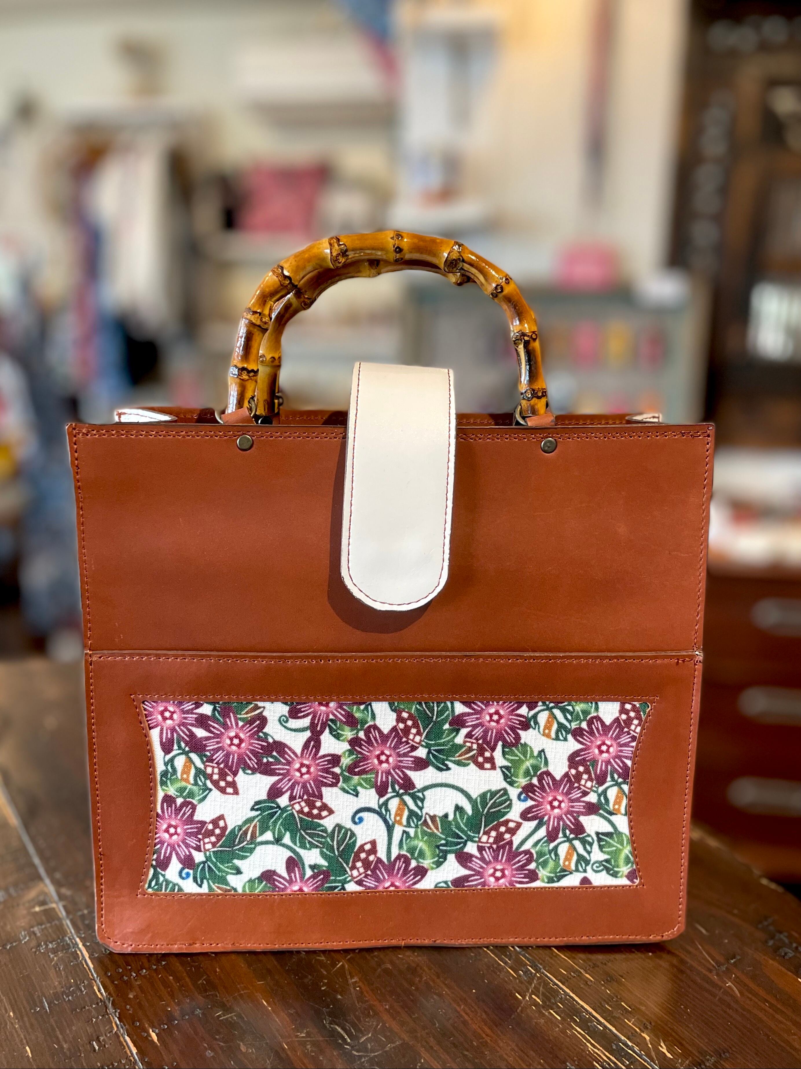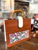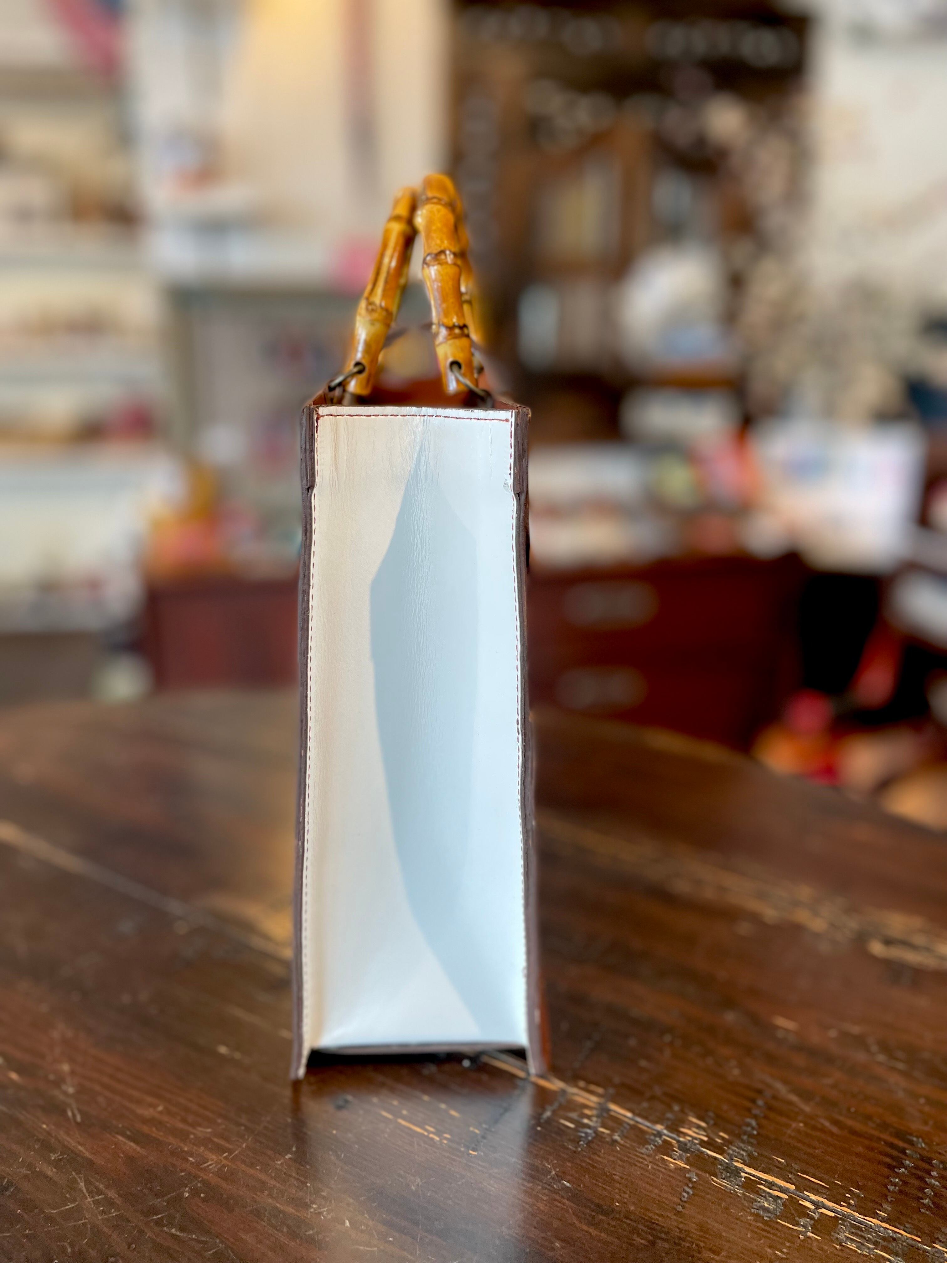 ブラウンとホワイトのバイカラーがカジュアルにもシックにも持てるデザインです。また、バンブー持ち手なのでお着物にも合わせやすいです。