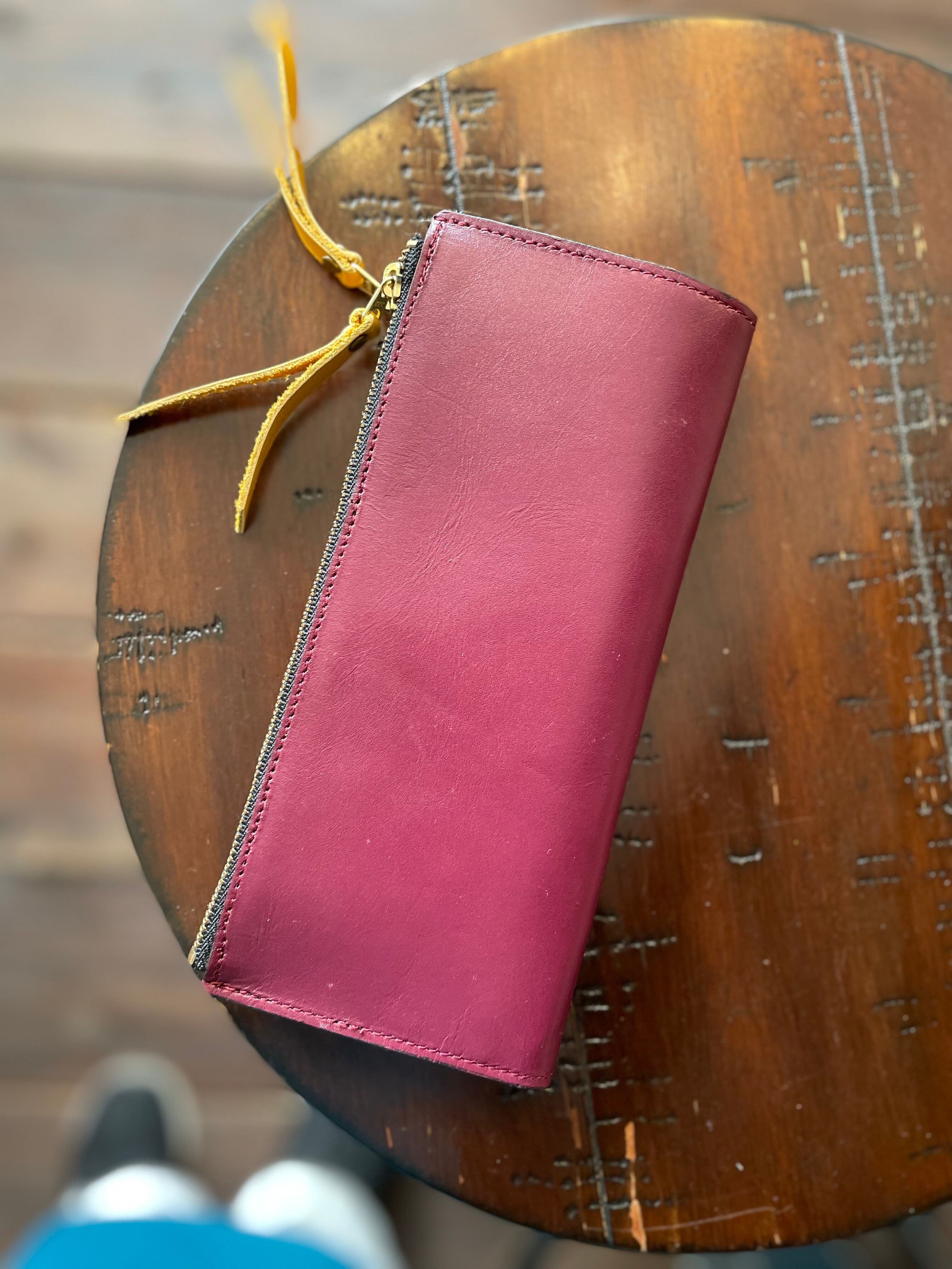 シックなボルドー革色に本染めディーグ、中にはネイビーをあしらったモダンなデザイン。差し色に合わせファスナーに辛子色の革色をアクセントにしています。