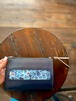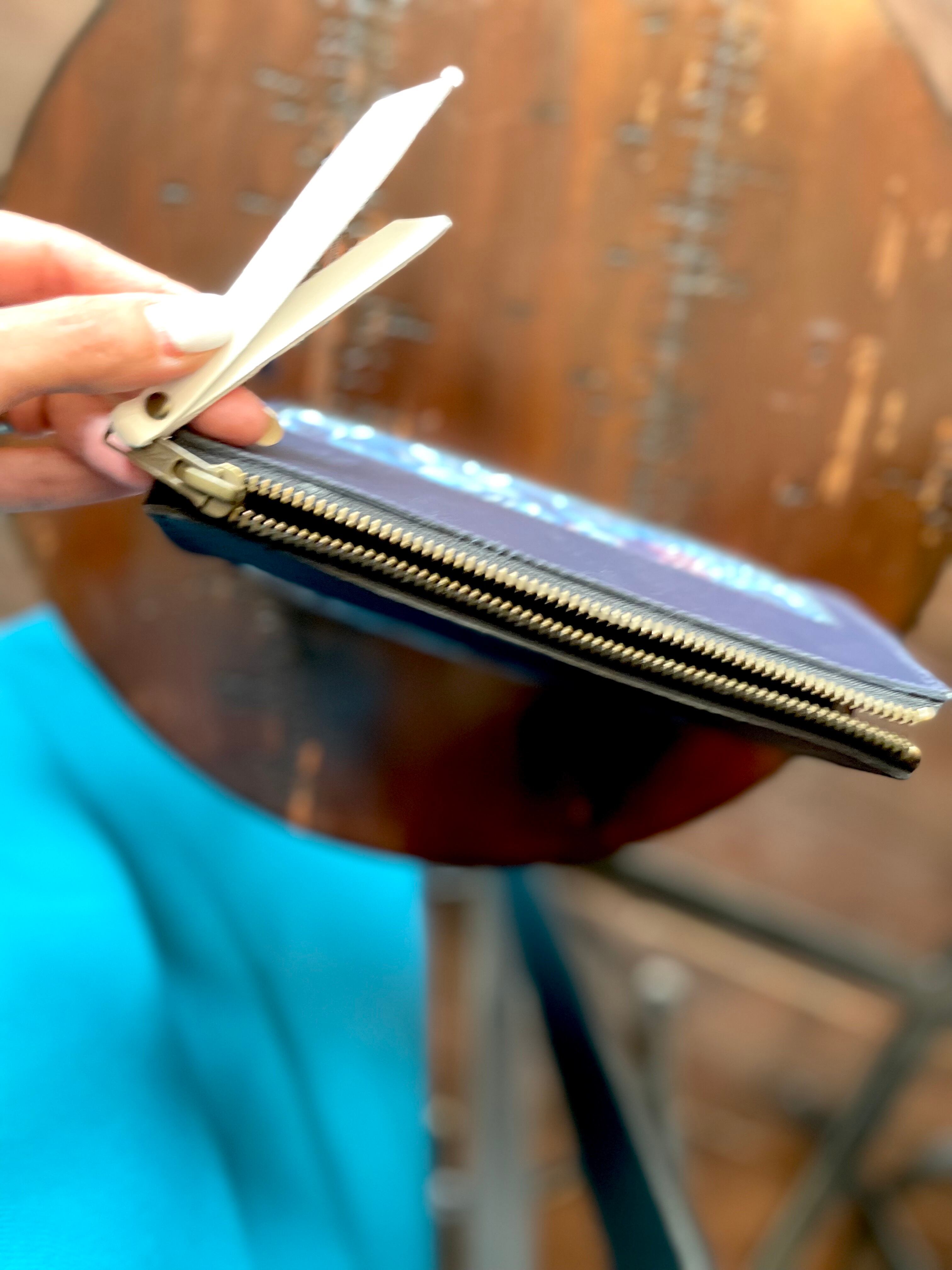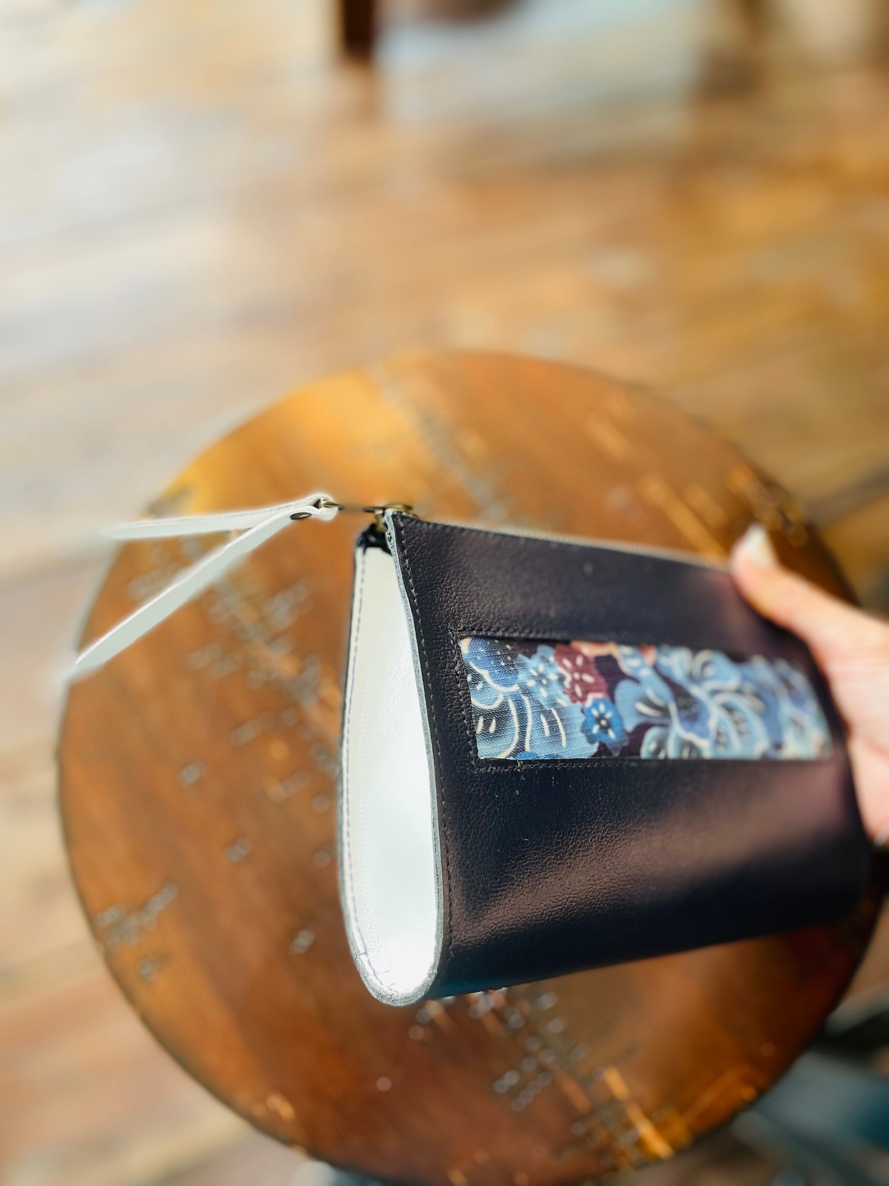 落ち着いたネイビーにホワイトのバイカラーにハイビスカスがモチーフのクオーレをあしらいました。両面に柄を配置。ファスナーにつけたホワイト本革もシックなアクセントになっています。