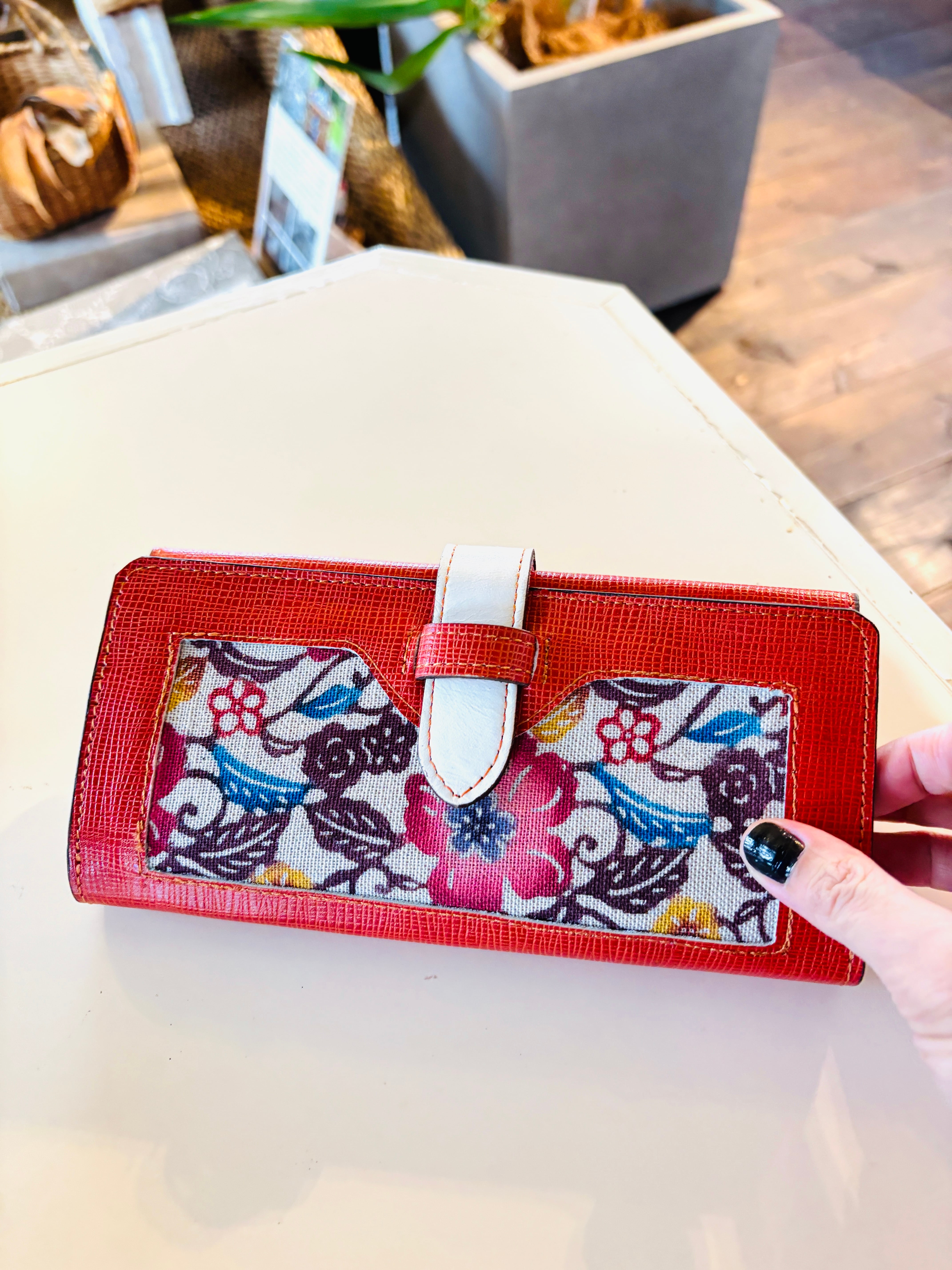 傷がつきにくいデザイン加工された本革にハイビスカスの紅型をあしらっています。